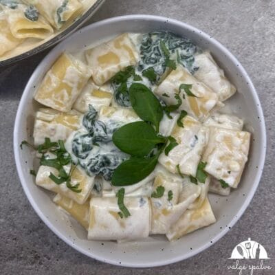 - Keptuvėje su aliejumi pakepinkite smulkiai supjaustytas česnako skilteles. Supilkite grietinėlę ir sudėkite smulkintą palėsinį sūrį. Išmaišykite iki vientisos masės. Sūriui ištirpus sudėkite špinatus.