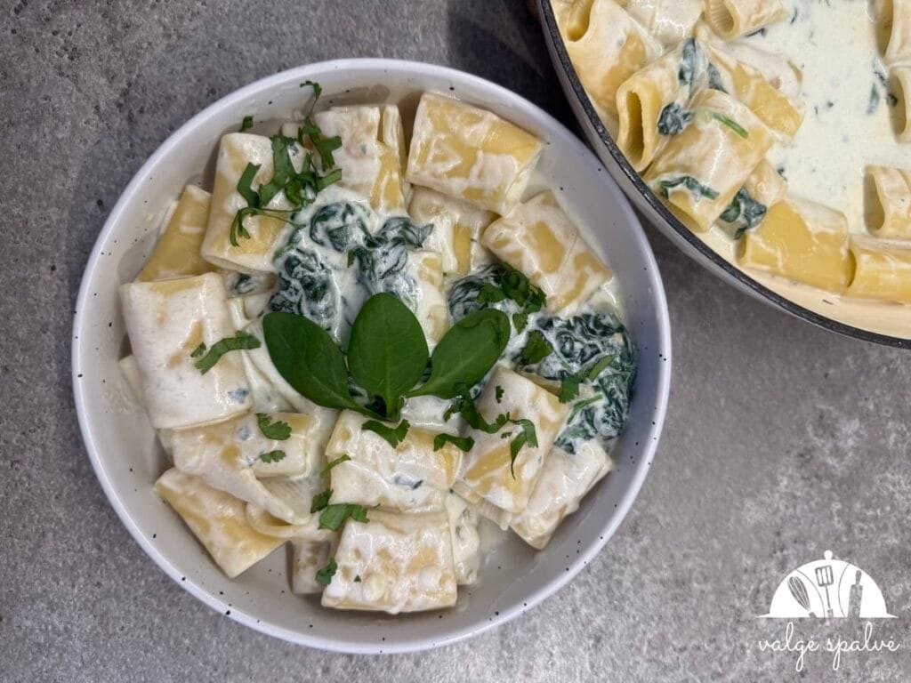 - Kai špinatai suvys sudėkite išvirtus makaronus.